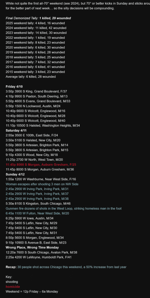 Final Demonized Tally: 1 killed, 29 wounded2025 weekend tally: 4 killed, 16 wounded2024 weekend tally: 11 killed, 42 wounded2023 weekend tally: 14 killed, 30 wounded2022 weekend tally: 1 killed, 19…