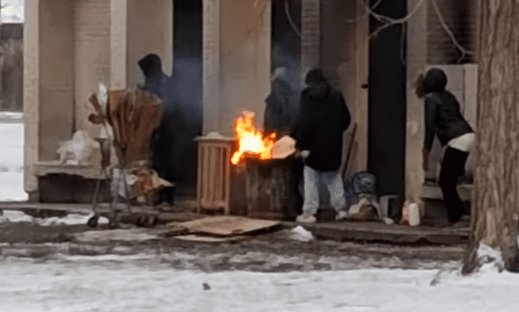 Scorch marks climbed brick walls where fires had burned, and a metal barrel at the park entrance served as an improvised fire pit amid snow, trash, and broken boards.