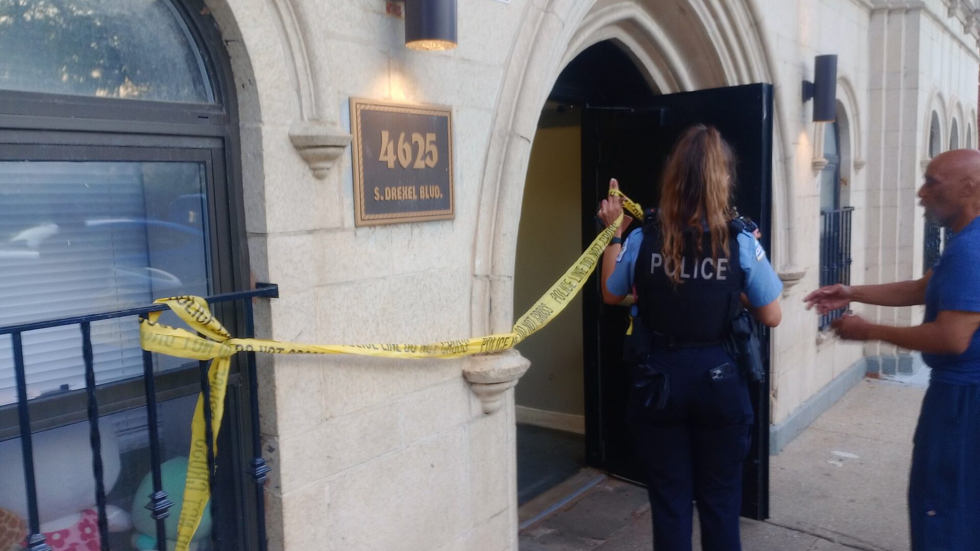 Image 4625 S. Drexel Blvd. with CPD on scene of arson in progress, police tape being put up/taken down, and a resident nearby.