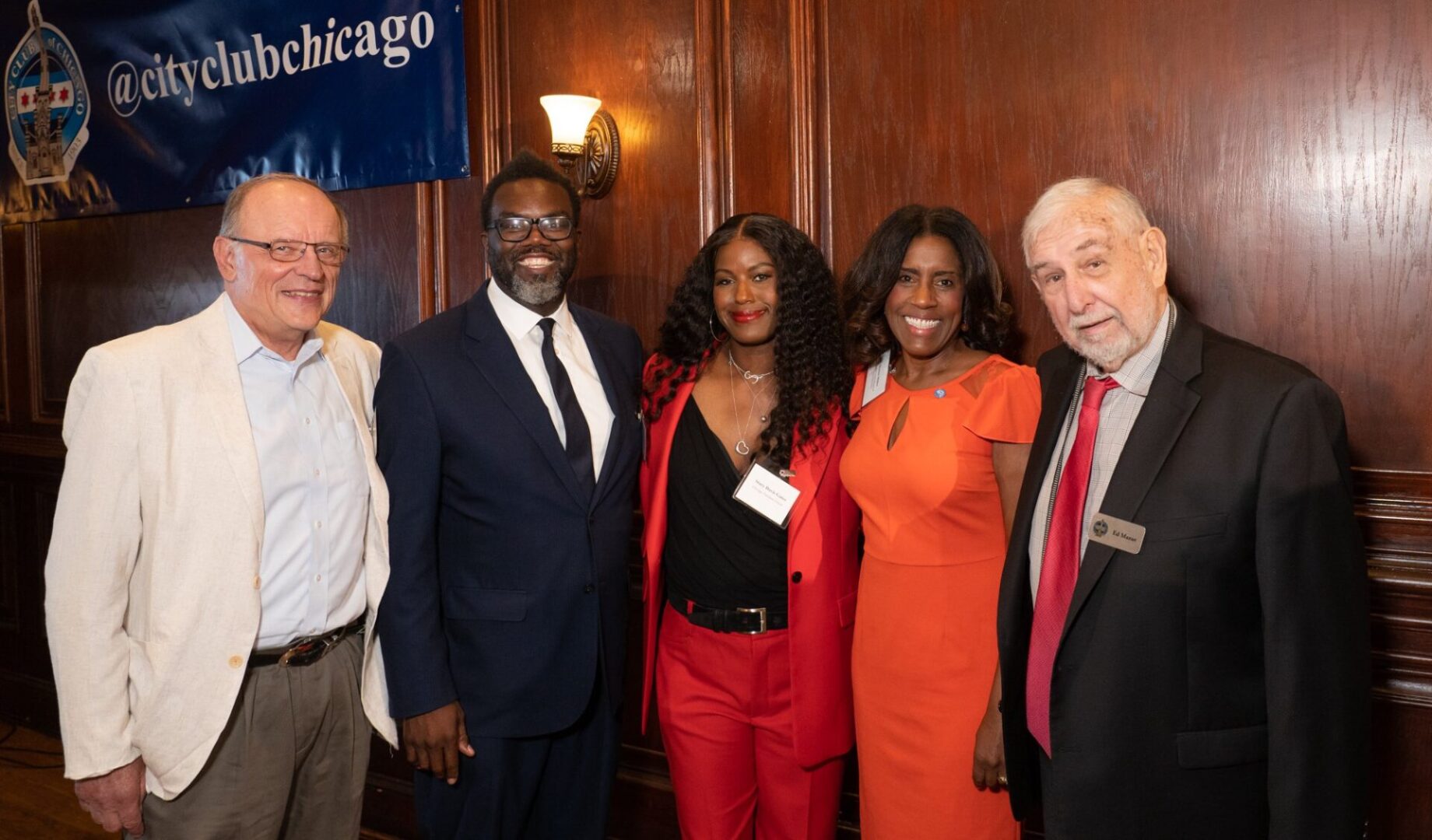 City Club of Chicago August 22, 2022. James Francek; Lead Labor Attorney for CPS; Brandon Johnson, County Commisioner, 1st District & CTU Employee; Stacy Davis Gates, Chicago Teachers Union President and speaker at the City Club; Donna Miller, County Board Commissioner, 6th District; Edward H. Mazur is the current Chairman of the City Club of Chicago Board of Governors and often serves as the program moderator. (credit City Club of Chicago August 22, 2022)