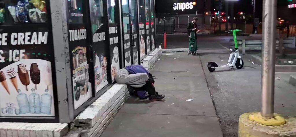 At Pulaski and Madison just after midnight, a woman was folded in half on the pavement outside a corner store, her body locked in the fentanyl fold. Her backpack sat under her, her legs twisted, her head sunk into her lap as if she had collapsed into herself. A tipped-over scooter lay nearby while another figure with a cart lingered at the edge of the lot.