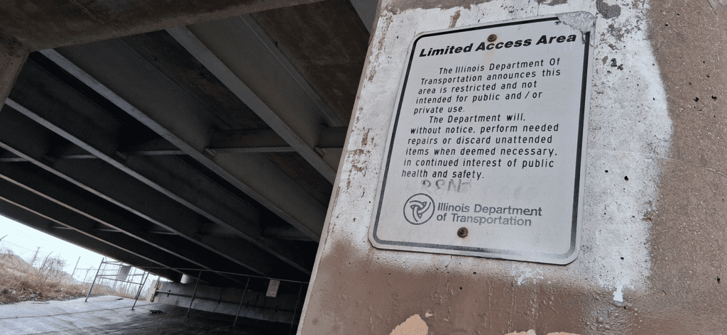 Limited Access sign under I-55 and Lock where fencing is installed to keep homeless people out next to crumbling CTA viaducts 645pm April 2nd 2026 Archer and Lock SubX.News®