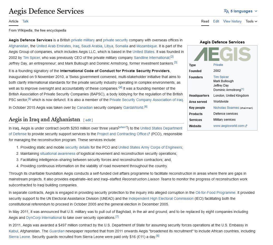On 27 October 2005 a number of “trophy” videos showing private military contractors in Baghdad firing upon civilian vehicles with no clear reason discernible from the footage itself sparked two investigations after they were posted on the internet. The videos were linked unofficially to Aegis Defence Services. Both the US Army and Aegis conducted investigations into the video; while the Aegis report is closed for client confidentiality reasons, the US Army enquiry concluded that the contractors involved were operating within the rules for the use of force. More4 News broadcast extracts of the videos in March 2006. The video showed Matthew Elkin (former U.S. Army Ranger and lead security contractor) denouncing the contractors and ordering a cease fire. Aegis benefited from CPA-mandated immunity from prosecution by Iraqi authorities.[8]
