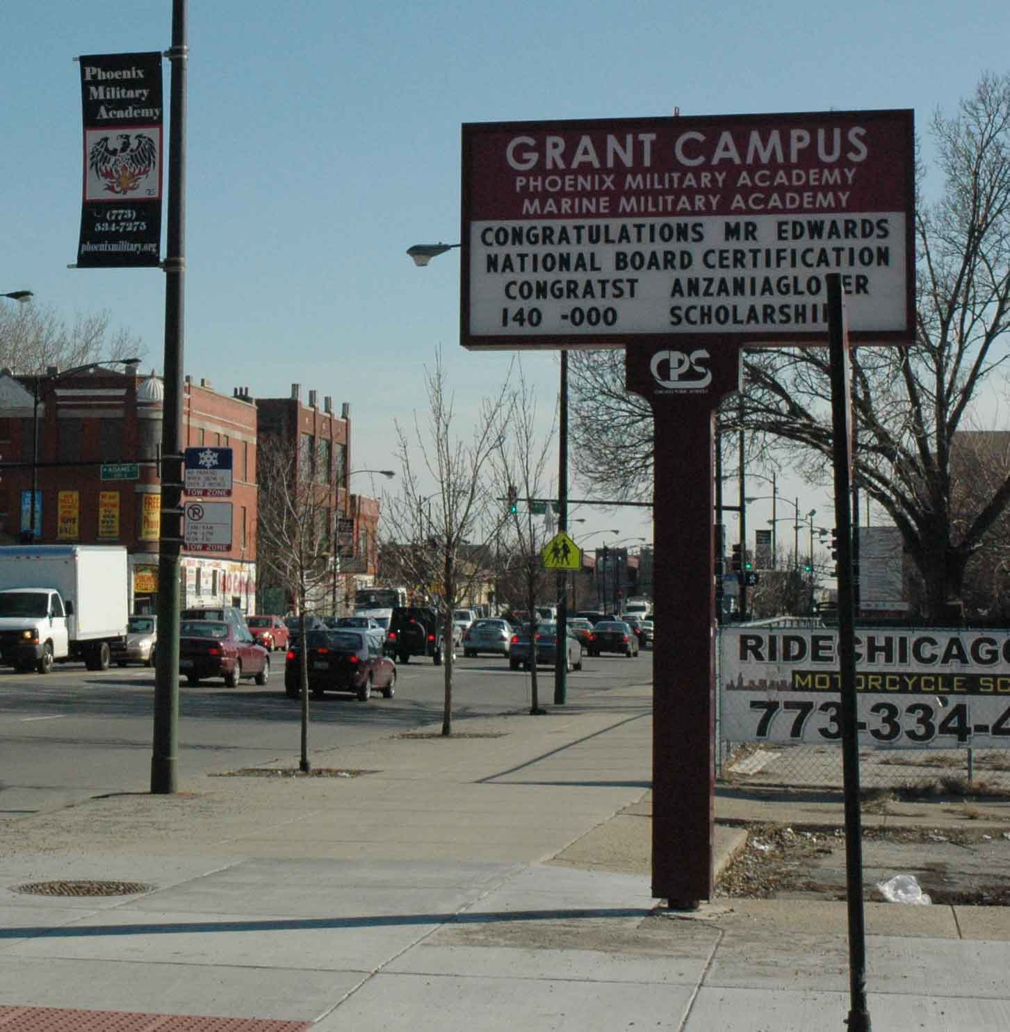 One group of teachers from the “small schools” at Orr will not be fired this month. At the end of the 2006-2007 school year, Arne Duncan moved the “Phoenix Military Academy” from Orr to the Grant School “campus” near Adams and Western Ave. (above). Mayor Daley protected his military program from the pogram he was preparing for the rest of Orr.