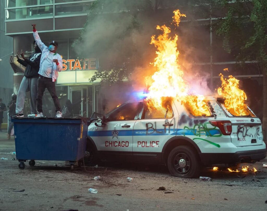 Chicago Police SUV burning in the Loop during the May 30, 2020 unrest following the death of George Floyd